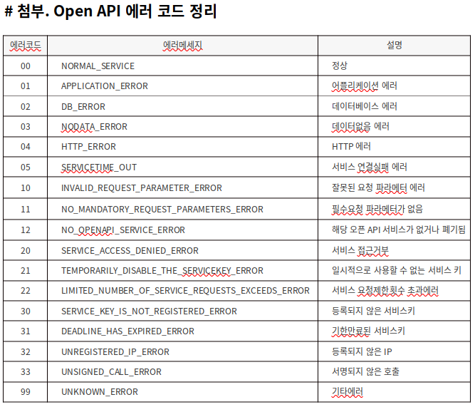 기상 데이터 API의 명세에 작성돼있는 에러 코드입니다. '00' 이 아닌 상황에 대해서는 return False를 주도록 Custom Sensor를 작성하였습니다.