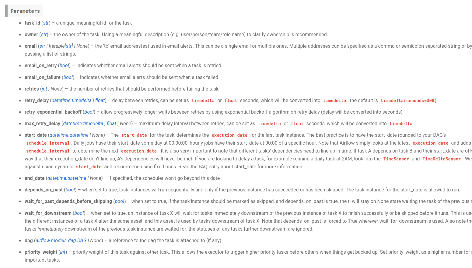default_args에 설정할 수 있는 파라미터는 Airflow의 BaseOperator 클래스 생성자에서 제공하는 파라미터들입니다.